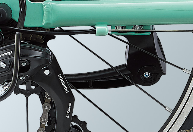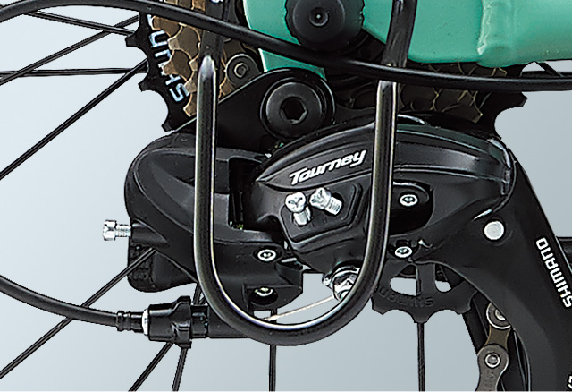 リアディレーラーガードを標準装備し、転倒時も車体へのダメージを最小限に抑える。