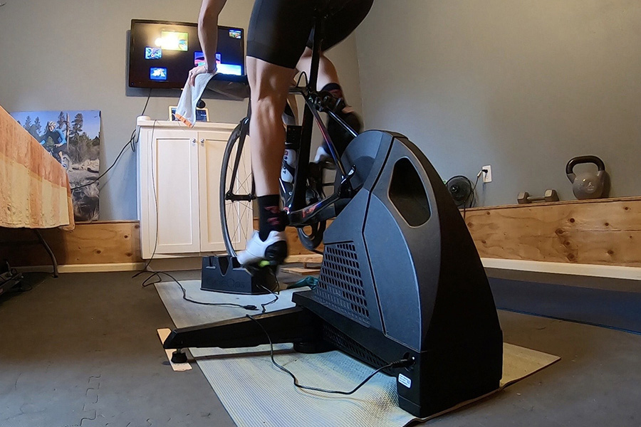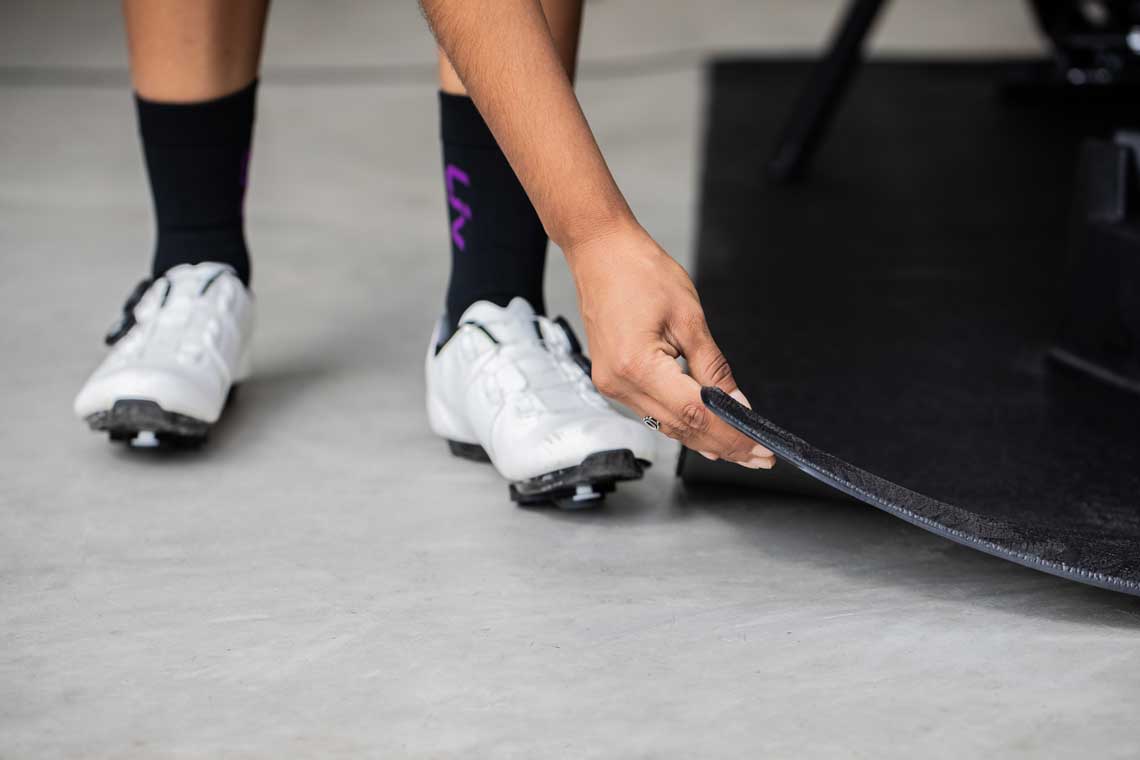 インドアサイクリングでは汗をたくさんかきます。扇風機や空調を使わずにいると、あっという間に暑くなってしまいます。トレーナーは床面が硬い部屋に設置することをお勧めします。また、滴り落ちる汗から床面を保護することが重要です。ヨガマットを2枚重ねして使っても効果はありますが、トレーナーやワークアウトに特化した専用のマットなら、騒音や振動を軽減することができます。