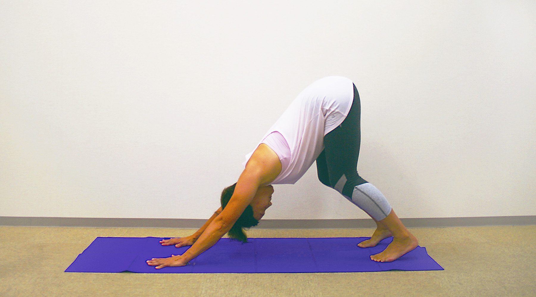 2. 足先を立てて手のひらでマットを前へ押し出すようにし、両ひざをマットから上げます。はじめは膝が曲がっていたり、踵が浮いていてもオーケーです。