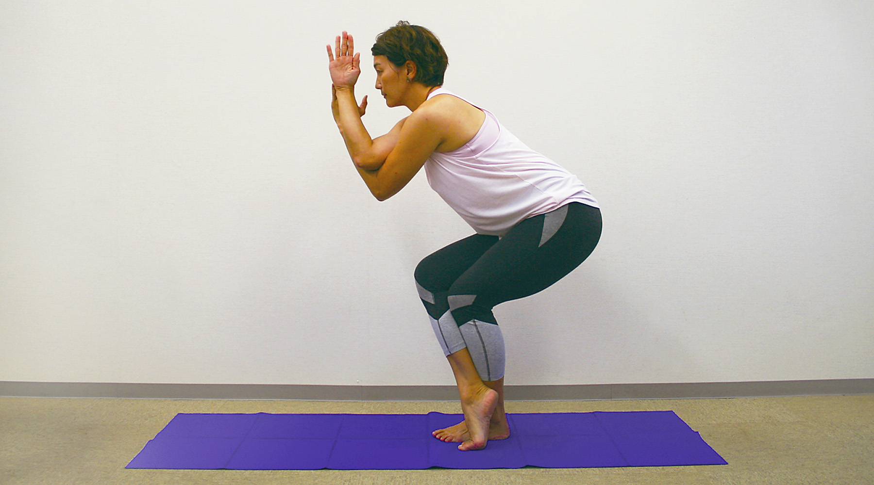 3. 上に重ねた脚のつま先をマットにつけて安定させます。バランス・体力に自身のある方は、息を吐きながらさらに腰を低く落としていきましょう。