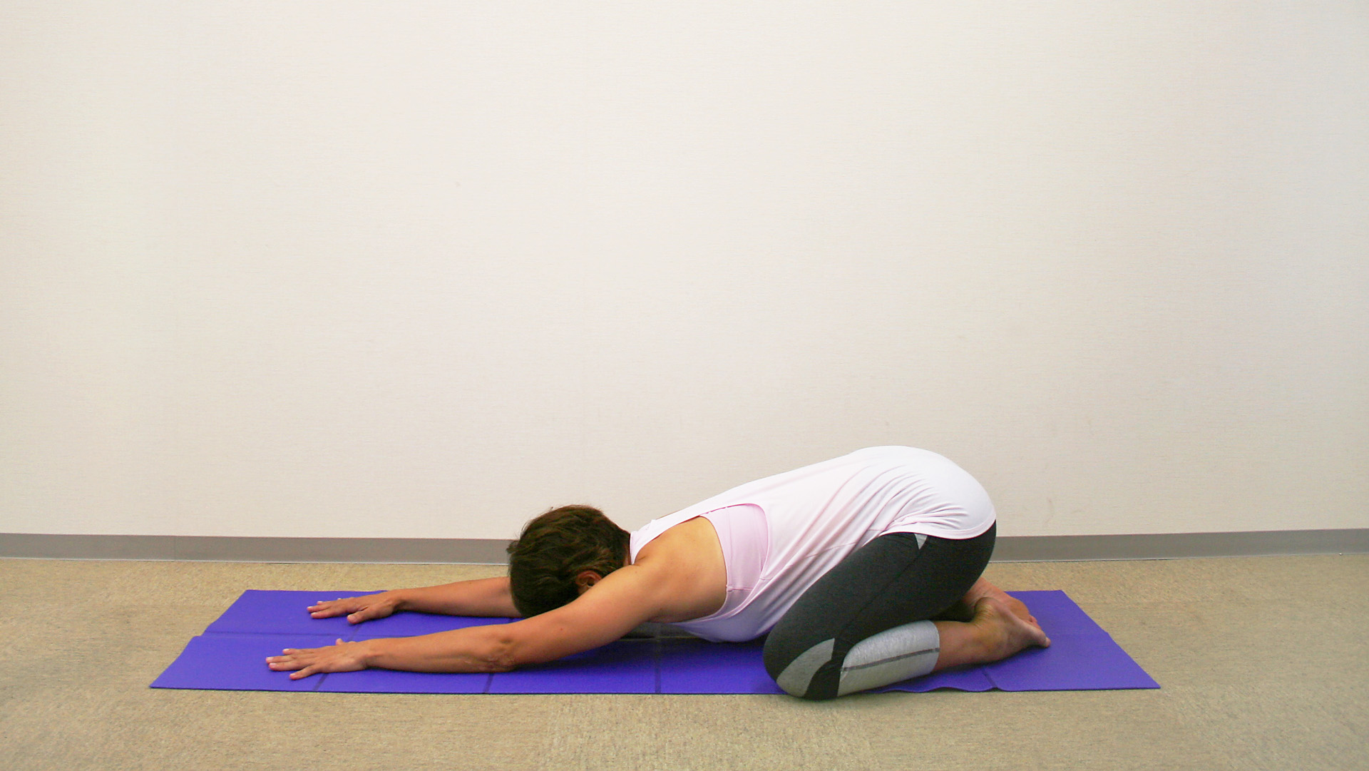 2. そのまま手を前へ移動し、上半身をのばしていきましょう。可能な方は、額をマットに付けて頭の重みを預け首や肩の力を抜きましょう。