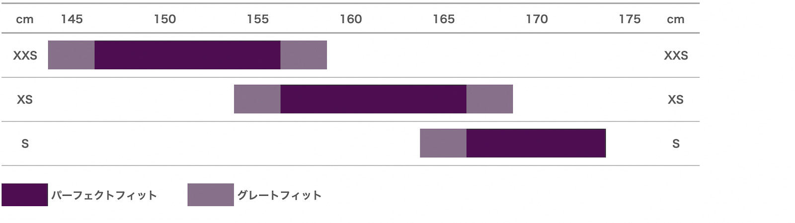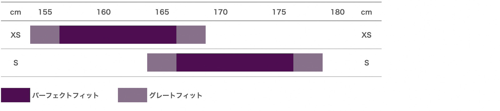 以下のチャートでは、ジャンル毎の身長に対する適応サイズをご確認いただけます。チャートはあくまでも参考値であり、適合を完全に保証するものではありません。サイズの選定については、正規販売店にてご相談ください。