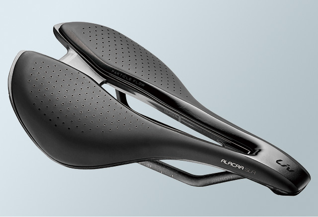 ショートノーズと女性の骨盤に合わせた幅広の形状で安定感とペダリング時の効率性、快適性を向上したカーボンレールのハイエンドサドル。ユニクリップシステム対応。