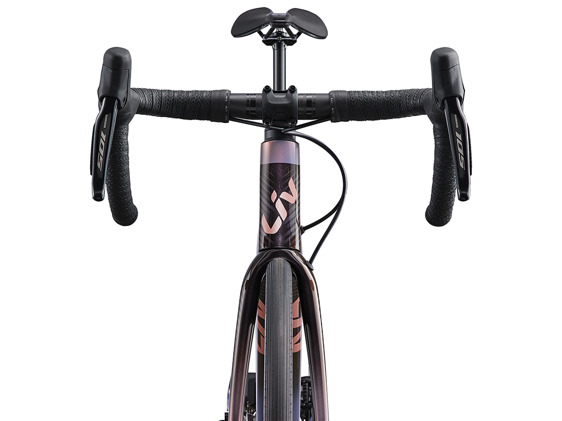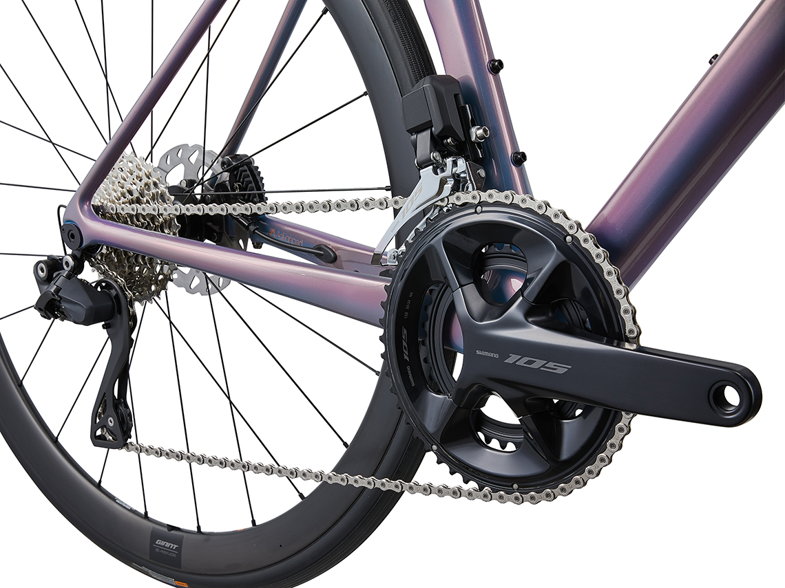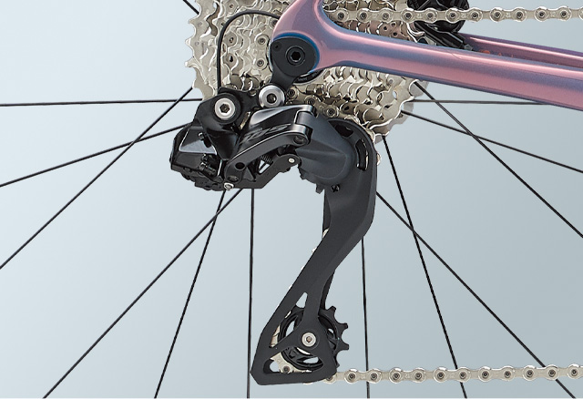 リア12速電動方式の最新シマノ「105」セミワイヤレス電動コンポーネントを標準装備。