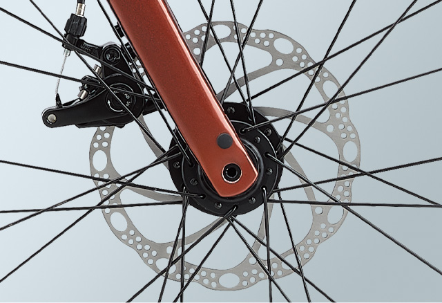 高剛性の12mmスルーアクスルとフラットマウントのディスクブレーキを前後とも採用。