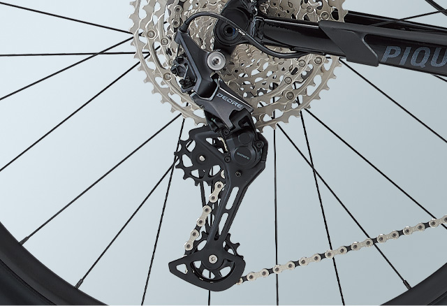 ワイドレシオで軽量性とシンプルな操作性に優れるシマノ「デオーレ」12速ドライブトレインを採用。