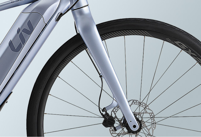 安定したハンドリングを支える下側1-1/4 コラムと12mmスルーアクスル採用のEバイク用アルミフォーク。