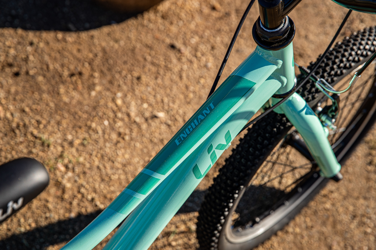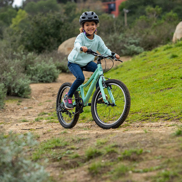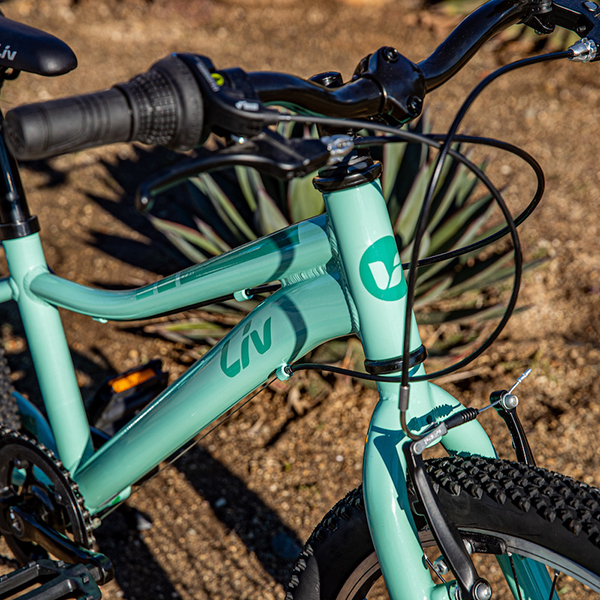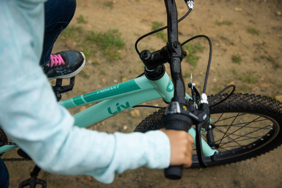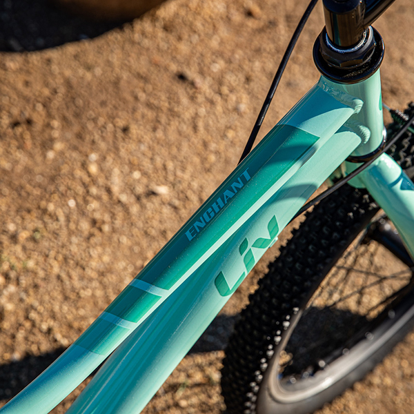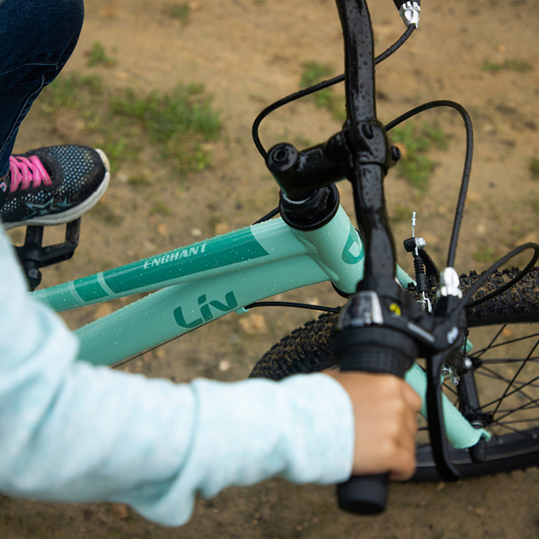 トレイルライドにチャレンジしたい女の子をサポートするため、またぎやすい低めのスタンドオーバーハイト(※)や直感的に操作できるシフトレバーなどの適切な性能を備えたマウンテンバイク「エンチャント」。ワイドなタイヤによって、トレイルのデコボコをスムーズに走り抜けてくれます。