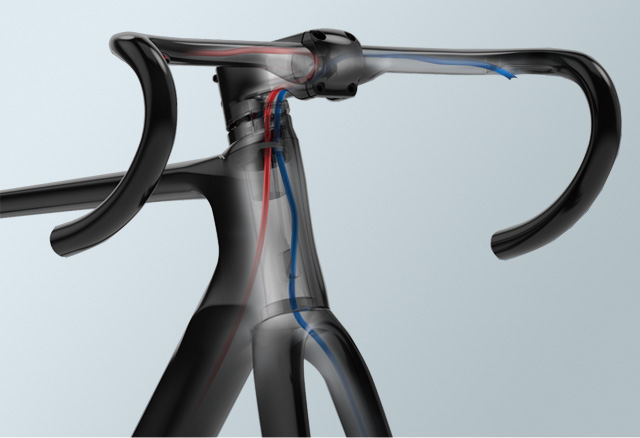 新型ENVILIVシリーズに採用される独自のD型形状ステアリングコラムと専用スペーサーによって、エアロ性能とメンテナンス性を両立する内装ケーブルシステムテクノロジー。